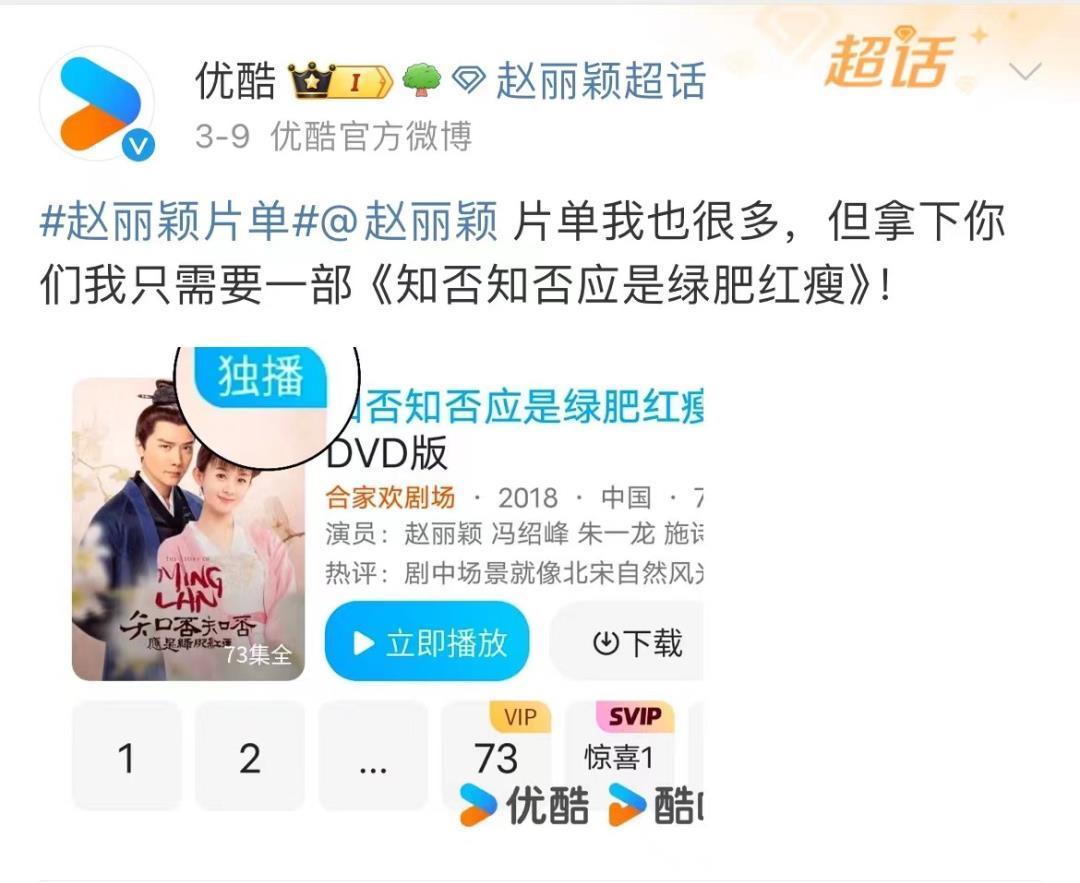 虽非播出平台,优酷和爱奇艺也在火速加快“商战”。刚刚在客岁底因为《知否知否应是绿肥红瘦》独播权大赢一把的优酷,不仅推出了赵丽颖片单,更是喊话“拿下你们我只需要一部《知否》”。爱奇艺相通在剧集板块上线了赵丽颖作品书籍。