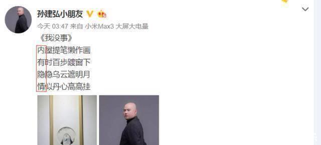 孙建弘不胜网络公论的“阑珊”,被动关闭了驳斥。凌晨时,他发了一首藏头诗,标题叫《我没事》,把四句诗的头一个字连起来偶合构成了“内有隐情”这句话,思来这应该是孙建弘对此事件的回答。
