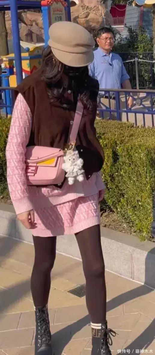 整套造型用了四个色系,粉红色是基调,上衣打底是粉色至意、下装是粉色至意短裙,外搭了棕色马甲及棕色裤袜,还背了一个粉色斜挎包,脸色碰撞高出炸裂。粉色是很嫩的脸色,棕色是老气,搭上玄色马丁靴和浅棕色帽子,就一字:土。